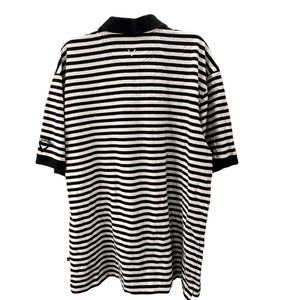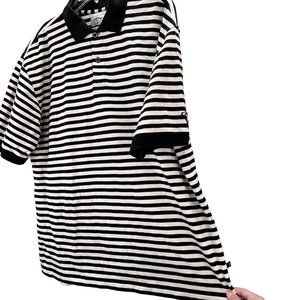 Callaway Golf Sport polo shirt in black and cream stripes. Short sleeves, textured knit, logos on side seam, side of sleeve, upper back and buttons. Good condition. 100% cotton. Size L.