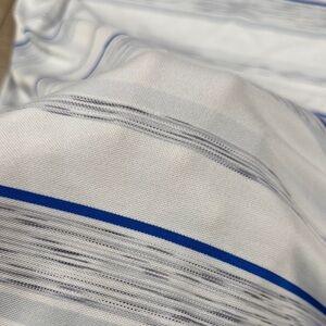 Color is white with a bold blue stripe and some heathered grays