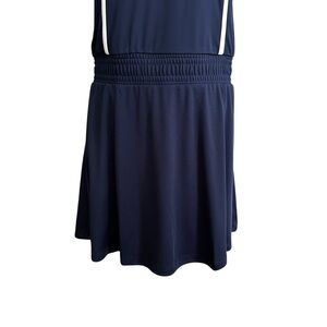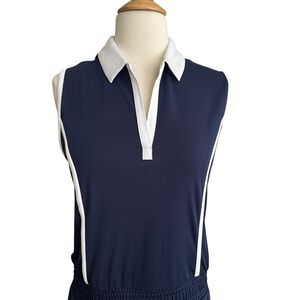 Stylish mini dress by Callaway. Features a navy body with white accents. Sleeveless design with a classic collar. Perfect for casual outings.