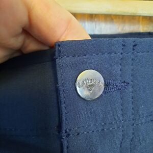 Callaway Performance Stretch navy blue flat front golf shorts MA4327 size 36. Metal button and zipper fly closure with belt loops, 2 hip pockets, 2 back pockets (still sewn shut), embroidered signature logo, comfort stretch interior waistband, and longer inseam. In excellent condition! Lightweight wrinkle resistant material 94% polyester 6% elastane. Size 36.