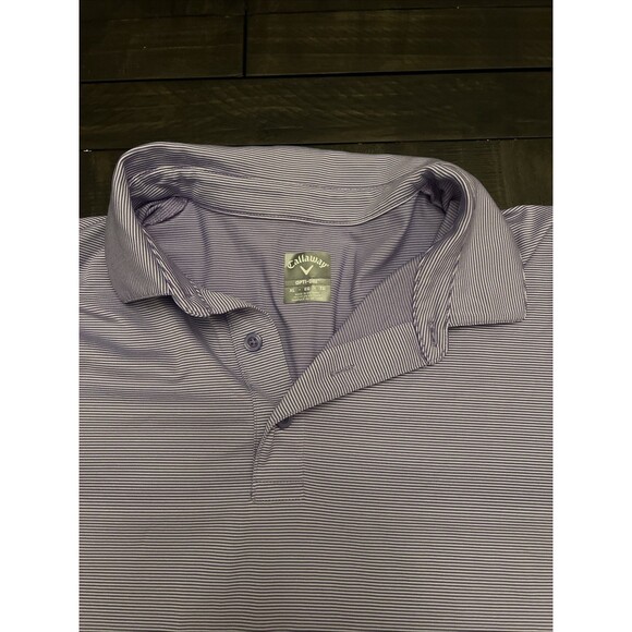 The Callaway Polo Shirt for men in size XL is a purple Opti Dri golf shirt designed for performance and comfort on the golf course. Made from a blended fabric of polyester and spandex, it offers stretch and breathability, perfect for active wear during the summer, fall, and spring. The collared shirt features a pullover closure, short sleeves, and a spread collar style, making it suitable for travel, casual outings, workwear, and golfing. With the signature Callaway logo as accents and a striped pattern, this polo shirt is a stylish and practical choice for those who appreciate quality and performance in their apparel.