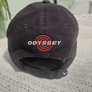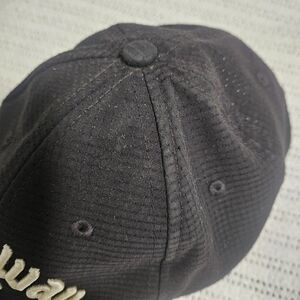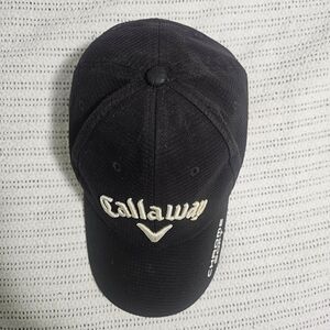 Black chrome soft performance fabric, UV 30+ protection, low profile and semi structured design, adjustable flap with bold white lettering.