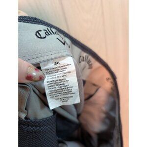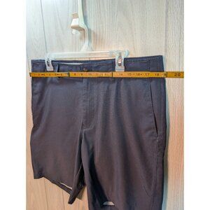 The Callaway Shorts in size 36 are a stylish and functional addition to any man's wardrobe. Made from a comfortable poly blend with stretch for performance, these blue-gray shorts feature a flat front design and a button closure. Ideal for travel, casual wear, and workwear, the shorts have a 10-inch inseam and slash pockets for convenience. The argyle/diamond pattern and subtle logo accents add a touch of sporty elegance, making them a versatile choice for the warmer seasons.