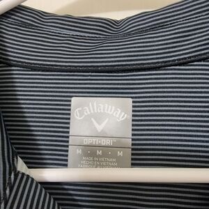 Callaway Size M Black & Gray-Blue Opti Dri Golf Polo. Excellent Used Condition, No Holes, Rips, Stains or Snags. Colorblock Shirt with Black Lower and Gray & Blue Striped Upper. Polo Style. Short Sleeve. Please refer to measurements in photos to ensure proper fit.