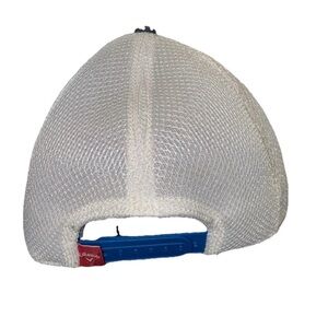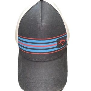 Great looking Callaway golf hat. Charcoal front with red & blue stripes. White mesh back with blue snap adjustable closure. One size fits most.