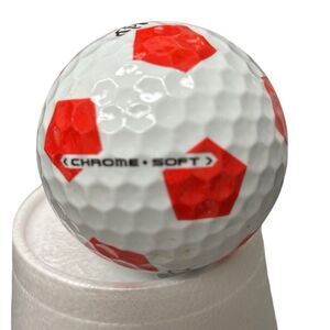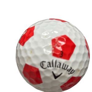Callaway Soccer Ball Logo Chrome Soft Golf Ball. Golf ball has some marks on it and a flaw in the red polygon with the 3 in it. See photos.