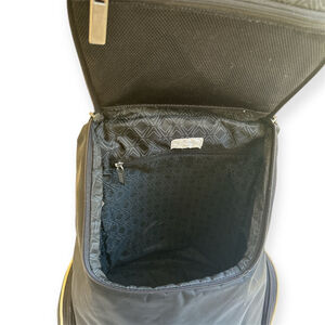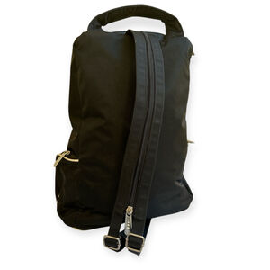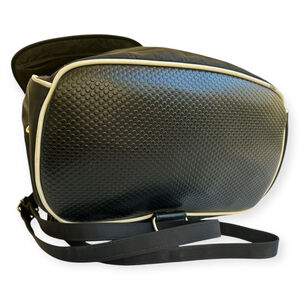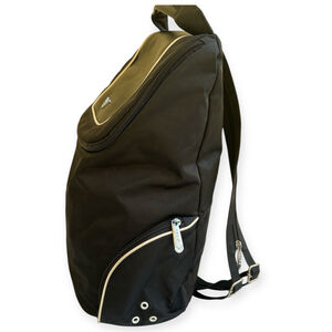 Pre-owned black nylon and women’s shoe golf backpack. Features include a main compartment with zipper closure, a smaller zippered pocket on the front, and adjustable sling or backpack straps. The bag shows minor wear consistent with previous use. Dimensions are approximately 16"H x 12"W x 6"D. The bag is in great condition with no damage. Zippers are embellished with rhinestones. Rare, high quality bag!