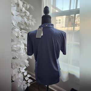 This is a Callaway Golf women's polo shirt in a blue heather pattern. It has a collared neckline, short sleeves, and a button-down front. The fabric appears to be a lightweight, breathable material, ideal for a day on the golf course.