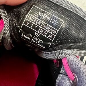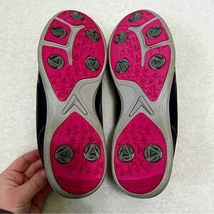 Callaway branded women's Sky Series Solaire style golf shoes in a grey and black color with pink laces and inner soles, tie closure, breathable breeze mesh upper, spike-less outsole, ETS (engineered traction system), lightweight, low-profile EVA and rubber outsole for improved balance.
