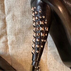 Make a bold statement with these sleek black leather mule heels. Featuring a closed-toe design and slip-on style, these shoes combine comfort with edgy sophistication. The standout detail is the cone-shaped heel embellished with metallic studs, adding a chic and modern touch. The platform sole provides extra support and balance while maintaining a stylish silhouette.