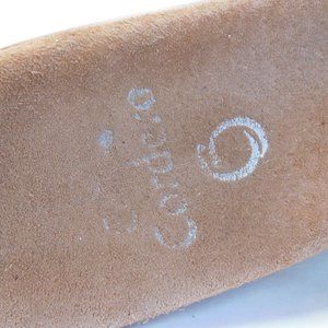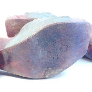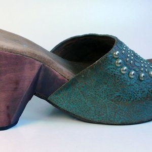 Calleen Cordero Hand-studded brass clog with padded suede insole. Hand-carved wood platform. Blue and brown embossed leather. I wore these about 4 times but then moved to the country and find myself not having an opportunity to wear anything but boots. I purchased these in New York City. The original price tag was $375, I purchased in the fall so got them on sale. They are a generous size 9.