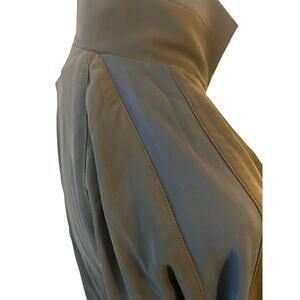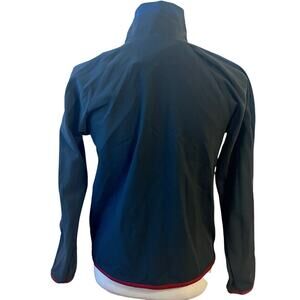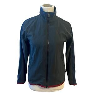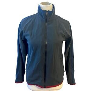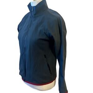 Amazing lightweight jacket. No size or fabric tag. Measures approx 18” pit to pit. Full zip. Subtle wide stripe down arm. Contrast trim on neck and cuff.