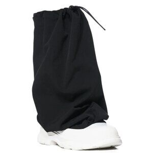 The Miz AZALEA WANG Airlea Slouchy Sneaker Boot in Black features a stretchy nylon upper, a scrunched mid-calf-height shaft, and a chunky flatform sole. Complete with a rounded toe, a drawstring design, and a pull-on fit.