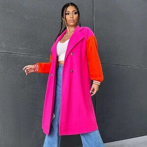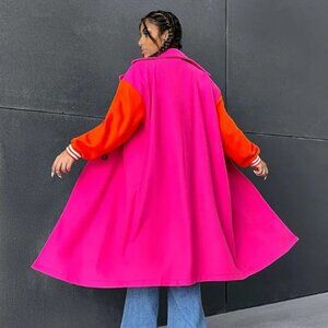 You won't get overlooked in the Callie Oversized Varsity 2Face Pink & Orange Trench Coat. Turn heads and make a statement with this bold, color-block coat that effortlessly blends street-style fantastic with classic sophistication. The vibrant hot pink body paired with eye-catching orange sleeves creates a one-of-a-kind look that’s perfect for standing out. Its oversized fit offers comfort and a trendy silhouette that’s right on point for the season. The sporty varsity-style cuffs add a playful touch, while the double-breasted closure keeps it timeless and versatile. Whether layering it over casual outfits or dressing it up, this coat is the ultimate piece to upgrade your wardrobe instantly.