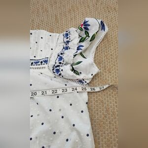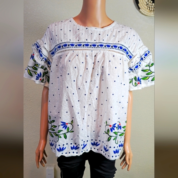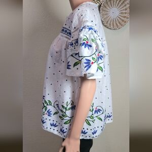 Chic and stylish women's top featuring intricate blue embroidery on a white background. Perfect for casual outings or a day at the office.