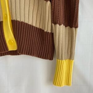 Calligraphy Women's Colorblock Y2K Retro Rugby Style Cardigan Sweater in tan brown and yellow striped multi textured knit styles.