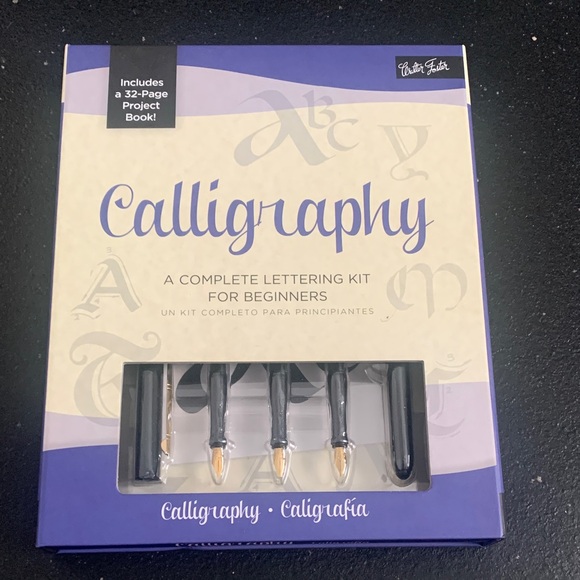 Complete calligraphy kit with pens and project book. Perfect for beginners. Packaging is open, but pens and book are unused.
