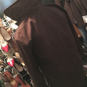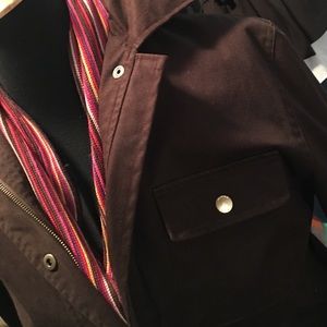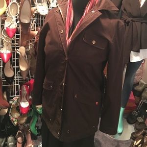 Chocolate brown zippered, and snapped front coat. Gold tone hardware, four pockets in front perfect for layering or alone!