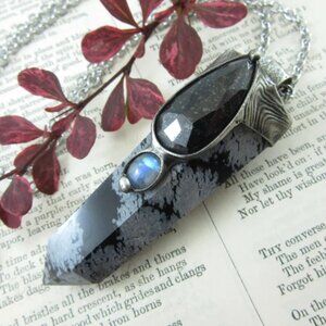 One of a Kind Beautiful Callisto Jewelry Snowflake Obsidian Black Ruby & Moonstone Crystal Pendant/Necklace. Sits on a 30" stainless steel chain.