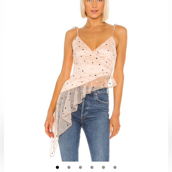 Super girly top! Looks amazing on. Fits a true xs. Zips on the side. Straps tie