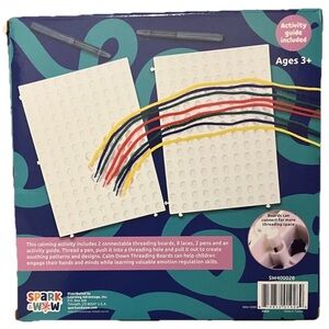 Spark & Wow’s threading set is a tactile relaxation activity recommended for ages 3 and up. The set comes with everything needed, including two threading boards that connect for a larger threading area. Two push pens help move the lace through the boards. An activity guide is included.