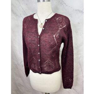 Calme Johnny Was y2k Burgundy Open Knit Cardigan Sweater Top S Wool Cottagecore