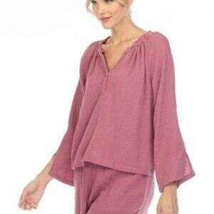 Calme by Johnny Was Liya Split Neck Mauve 100% Organic Cotton Top Size XS NWT