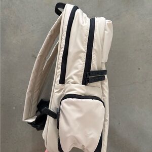 Elegant cream backpack by Calpak. Features a modern design with spacious compartments.