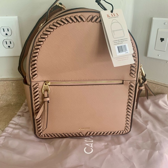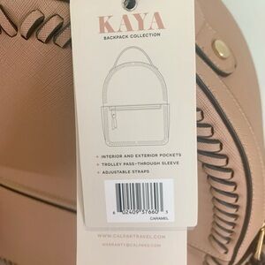 Featuring a zip closure, adjustable straps, and bottom studs, this backpack is both lightweight and functional. The interior is lined with polyester and includes inner pockets for organization and convenience. The faux leather exterior material looks and feels like real leather, while the lining color is beige. The CALPAK Kaya backpack is a part of their product line.