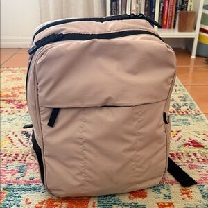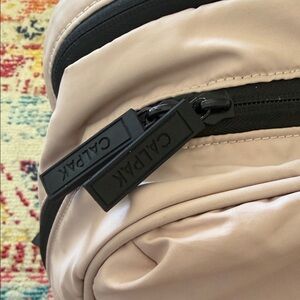 Sleek Calpak backpack in light pink. Smooth exterior with front zip pocket. Padded straps for comfort. Clean, modern silhouette for daily use.