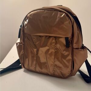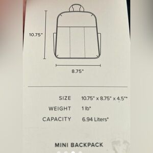 Dimensions: 10.75x8.75x4.5”. luggage sleeve & padded metallic exterior.