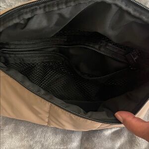Sleek tan belt bag with adjustable strap. Ideal for hands-free convenience.