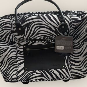 Brand new with tags. This chic Calpak Zanny tote features a bold zebra print exterior and vibrant purple interior. Perfect for travel, work, or everyday use with multiple compartments and rolling functionality for easy transport.