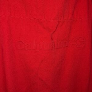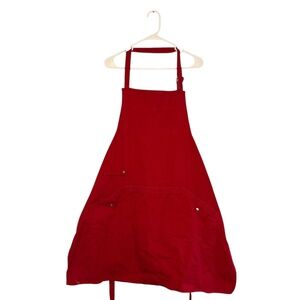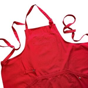 100% cotton red apron with an adjustable neck strap, four sectioned front pockets and embossed branding details. Made in China.