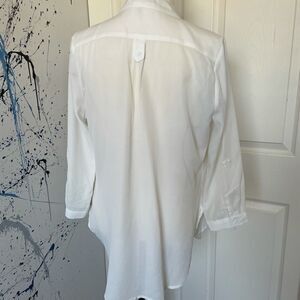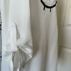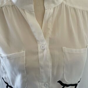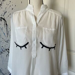Cals sold by ModCloth Eyelash Blouse. Semi-Sheer pullover blouse. Cleverly placed eyelashes under breast pockets. Sleeves can be buttoned up or hung down. Super unique and fun! Size Large. EUC