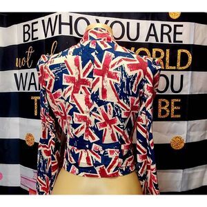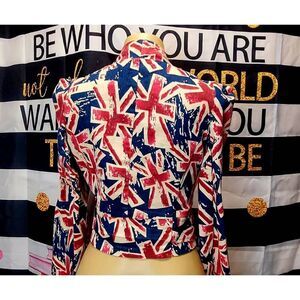 Vintage cotton British flag jacket. With assymetrical zipper. Zipper pull works but part of it broke off.