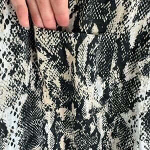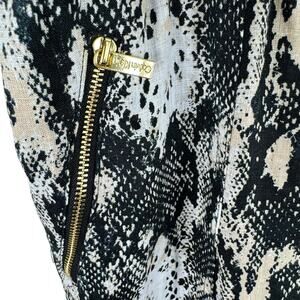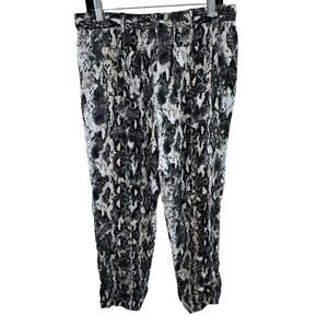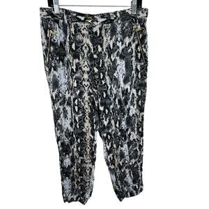 Excellent preowned condition. Snakeskin pattern lightweight straight leg elastic waist pants. Zipper/snap button closure at waist. Zippered pockets on front/open pockets on back. Pants legs roll & snap for cropped wear. 100% linen material. Approx. measurements: Waist 32", inseam 31", rise 10". Size 14.