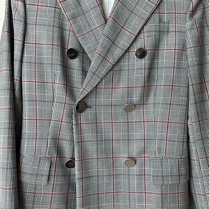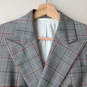 Calvin Klein 205W39NYC blazer jacket. 100% wool. Made in Italy. Dry clean only. Button front double breasted closures. Breast welt pocket. Side flap pockets. Padded shoulders. Back vent. Glen plaid pattern. Peak lapel collar. Lined. Black, red, and white. Size: US 2.