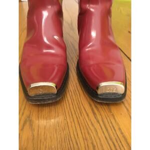 Elevate your Western-inspired look with these eye-catching cowboy boots from Calvin Klein x Raf Simons. Crafted in Italy from spazzalato leather, they feature a striking gray side stripe accent and a metal-capped square toe for added edge. The pull-on design and low Cuban heel make them comfortable for all-day wear, while the leather lining adds a luxurious touch. Size 38, US size 7.5. These boots run large, I wear a 7.5-8 and these boots are big on me. As can be seen in the photos, there is some wear on the soles, but otherwise the boots are in good condition.