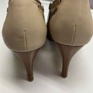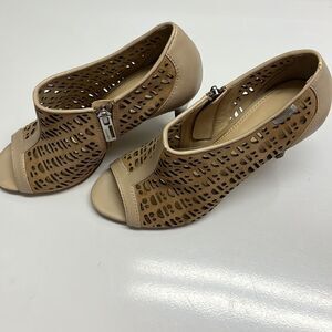 Calvin Klein 3.5” Beige Tan Peep Toe Zip Up Breathable Heels- 6M