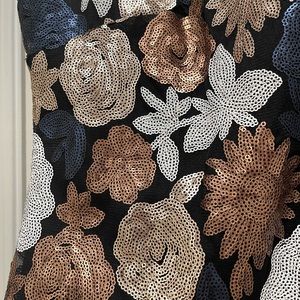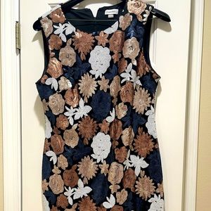 Sequin cocktail dress. Gold, navy, chrome and white flower pattern sequins. Sleeveless straight line- lined dress. Super comfortable