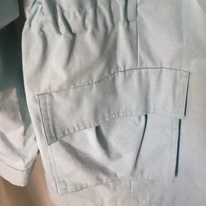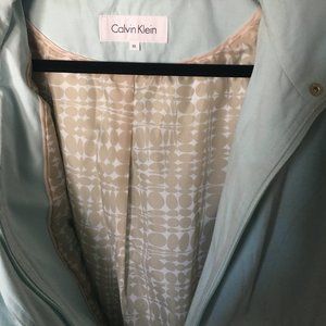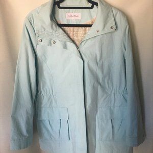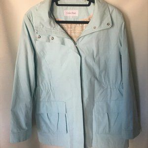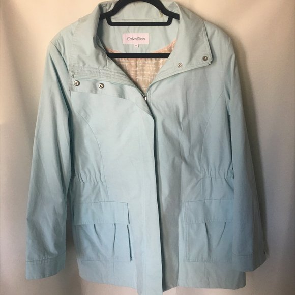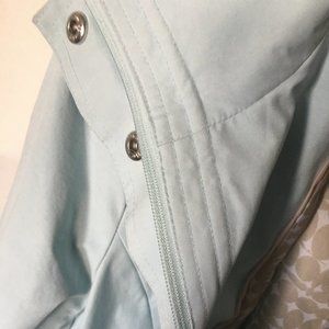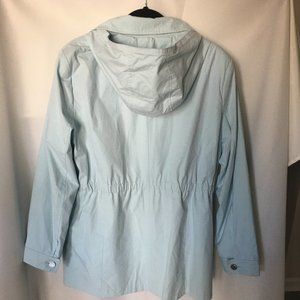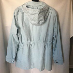 This is a great looking rain coat. Water-resistant shell, Removable hood, Zipper front. Long sleeves. 2 pocket and has embedded elastic to adhere to the waist area for additional coverage. Size XL. This coat was never worn and is in perfect condition! The color I would describe as a soft, soft seaform.