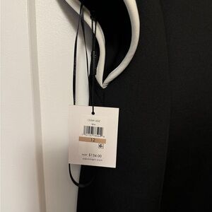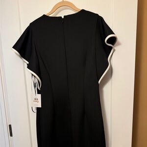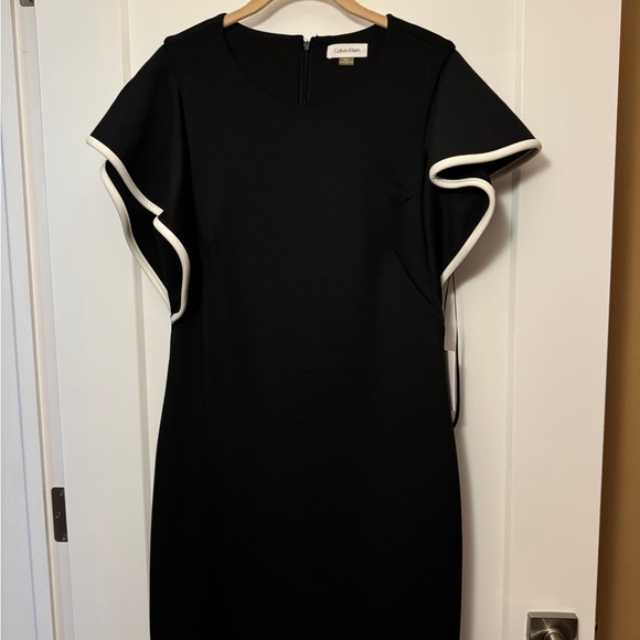Black sheath dress adorned with white trimmed ruffled sleeves.
