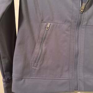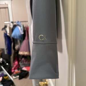 Calvin Klein Performance Full-Zip Hooded Jacket in a stylish greyish-blue color. This athletic jacket is perfect for workouts, layering, or casual wear. Features a full zipper closure, a hood with adjustable drawstrings, and two zippered front pockets for secure storage. The material is soft, stretchy, and designed for comfort and mobility. Excellent pre-owned condition with no visible flaws.