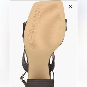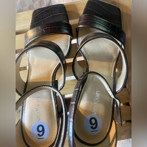 Calvin Klein 9 M, Dark Brown Sheryl Ankle Strap, Block Heel, Squared Toe Sandals