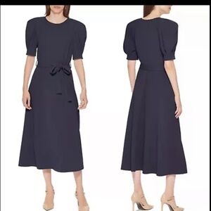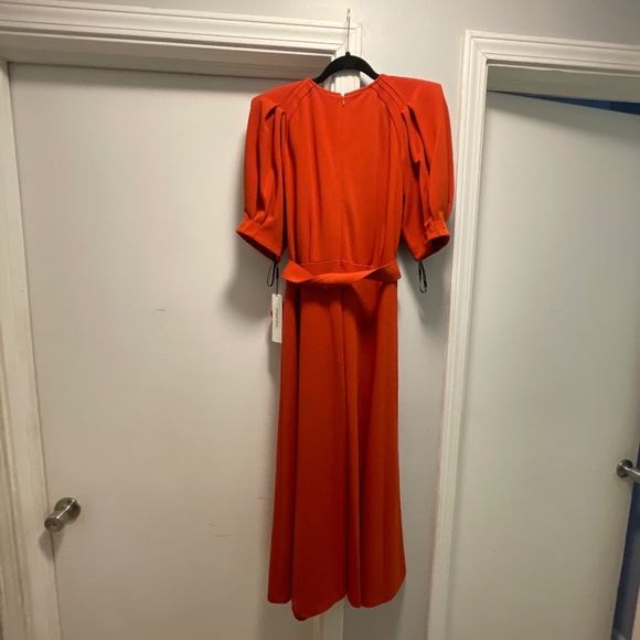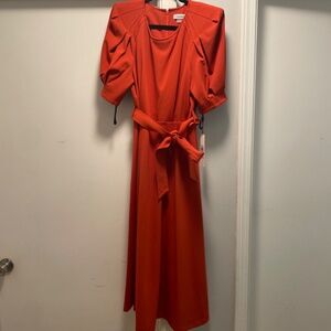 Brand New dress! Never been worn. Has a small snag on the front where the belt goes through the loop. Color I would describe as “Burnt Orange”. Not noticeable when tied in the front. No stains. Great for business attire or formal event.