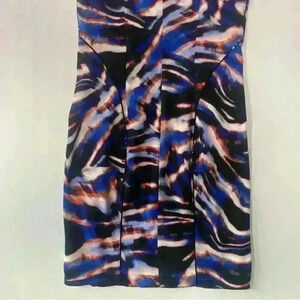 Calvin Klein white, blue, and orange abstract patterned sleeveless midi dress with black shiny stripes running vertically down front of dress giving an hour glass figure look. Back zipper enclosure and raw hem look. Gently worn. Size 6