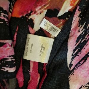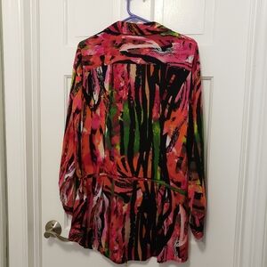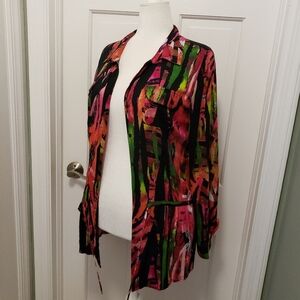 Calvin Klein Abstract Print Blouse Size Large, Rolltab Sleeves, Drawstring Tie at waist
