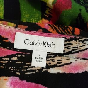 Calvin Klein Abstract Print Blouse Size Large, Rolltab Sleeves, Drawstring Tie