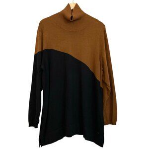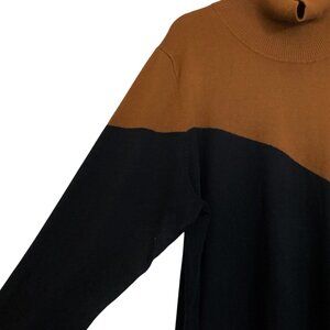 Sleek, chic, and totally unique! This Calvin Klein sweater is a must-have for your cool-weather wardrobe. It's a cozy, color-block dream in black and rich brown, featuring a modern asymmetrical design and a comfy turtleneck. The long dolman sleeves are so flattering, and the striking contrast ensures you'll stand out. Elevate your style with this sophisticated and fun statement piece!